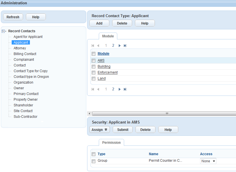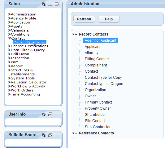 Civic Platform divides contacts into two categories: record contacts that users associate or manually add to records, and reference contacts that users work with from the Reference Contact portlet. You only need to define security for record contact types. If you go to the Contact Type Security portlet and expand the Record Contacts navigation tree node (see Figure 1), you can view all the contact types that are “for transactions” or “for both” in the CONTACT TYPE Standard Choice. You can then select a contact type and establish the security levels for modules, user groups, and individual users.