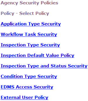 Civic Platform displays the Agency Security Policies—Select Policy page