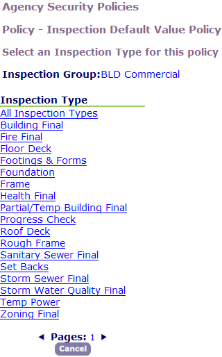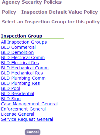 - Click the link for the inspection type you want to work with. To assign security settings for