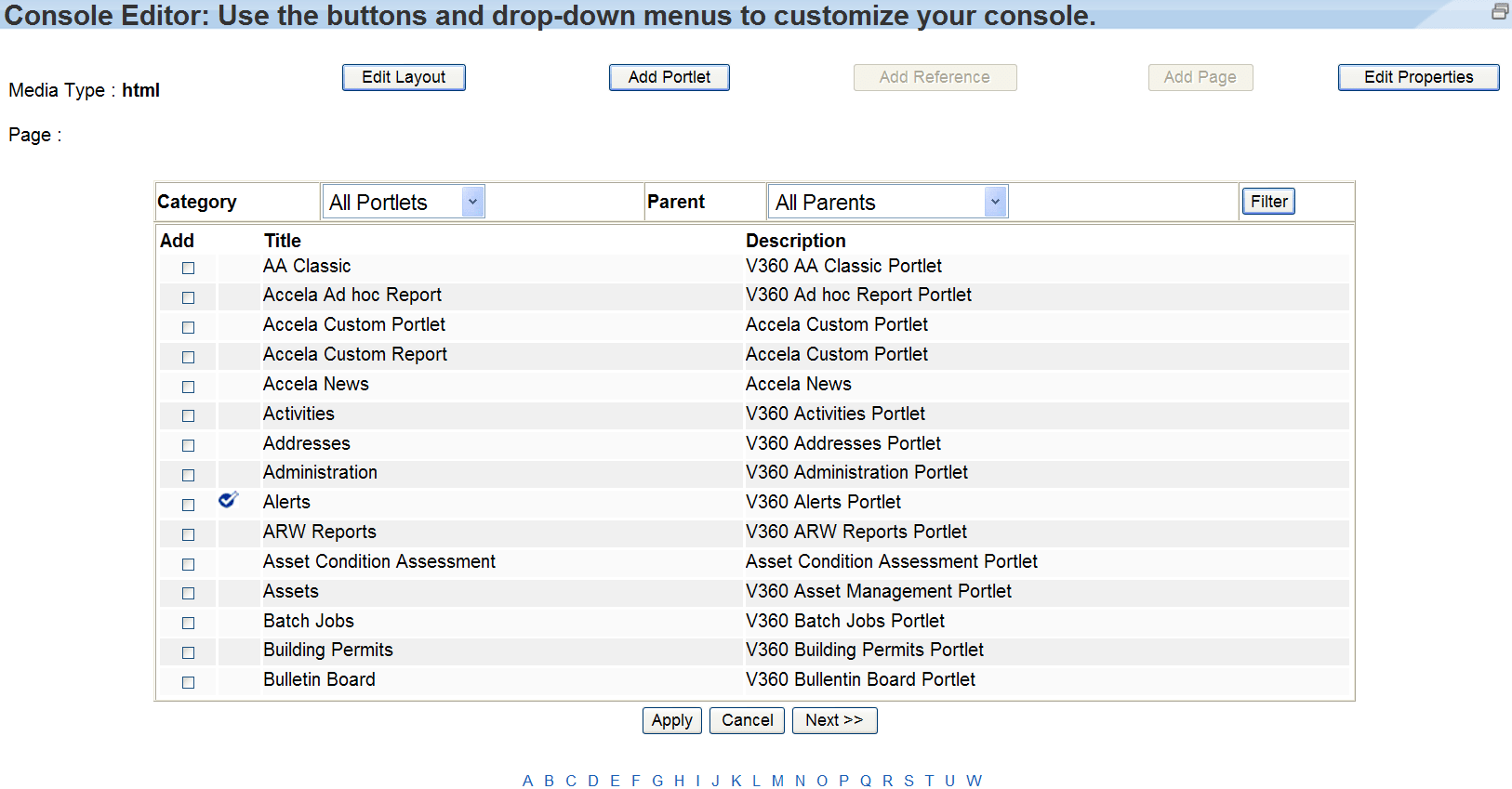 6. Locate the portlet you want to associate with the main link using the alphabetical links at the bottom of the page or the category and parent filters at the top of the page.