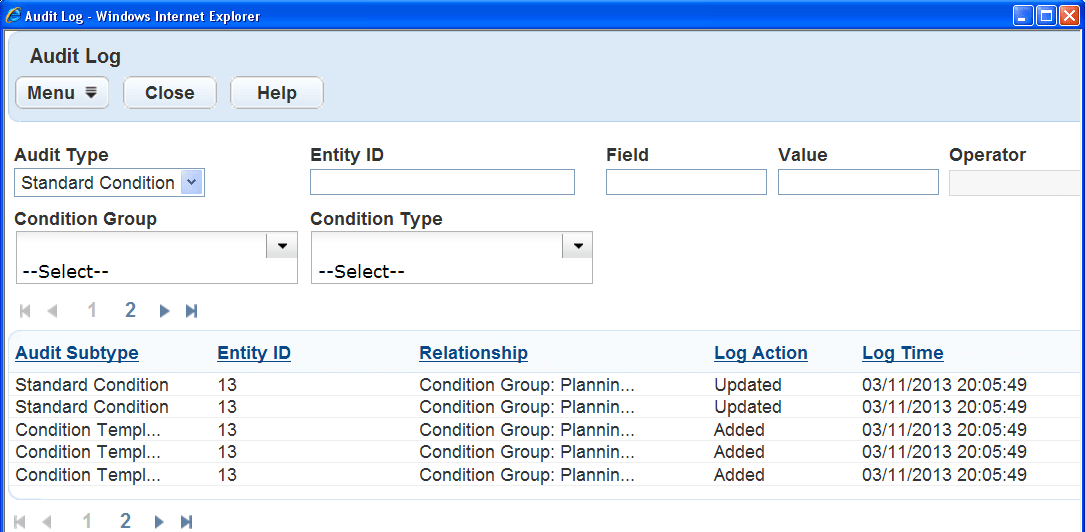 Administrators with access to the audit log can review condition the audit log from the condition list portlet and condition detail portlet. See Figure 1.