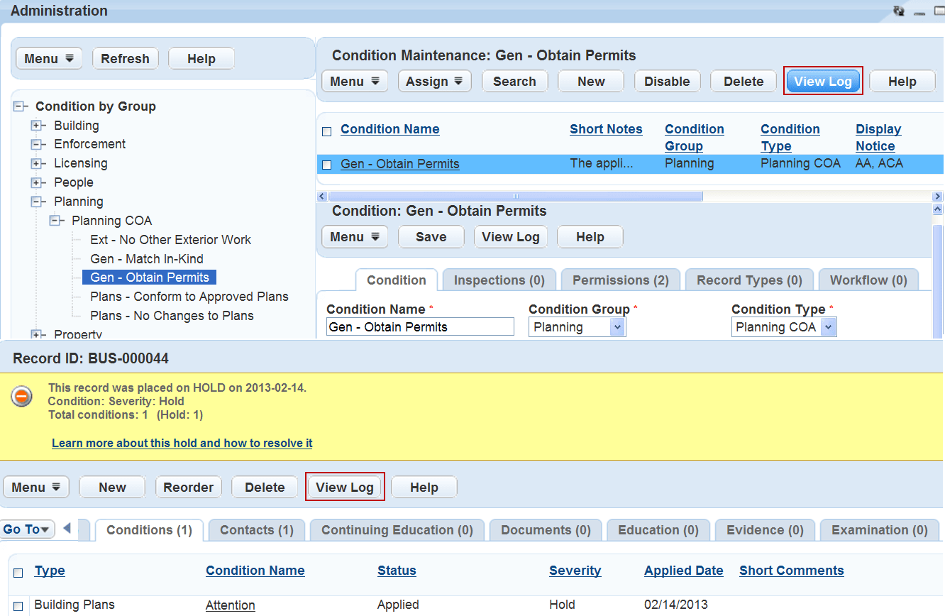 As an administrator, you can choose to enable the condition audit log functionality in Civic Platform. You can also grant yourself and agency users permission to access the condition audit log.
