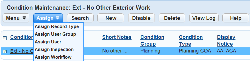 • To assign the condition to an Inspection Group or Inspection Type, click Assign and choose Assign Inspection.