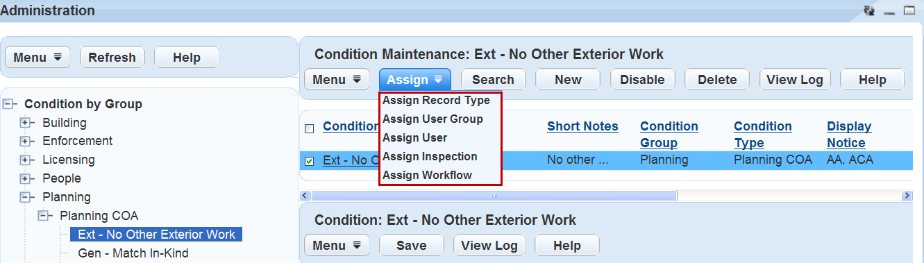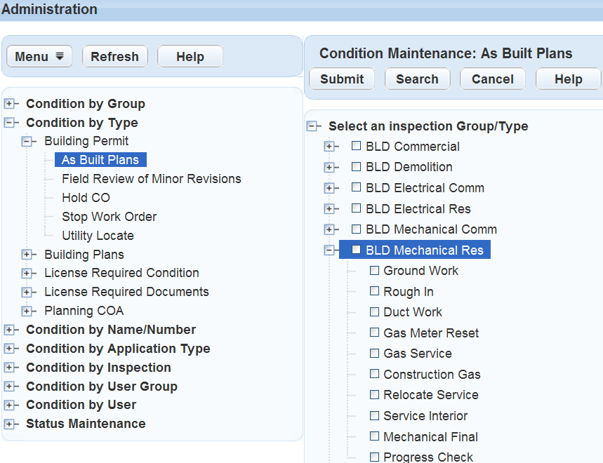2. Use the main Administration navigation tree to locate the condition you need. You can locate a condition by Group, Condition Type, Name/Number, Application Type, Inspection, User Group, or User. If you cannot locate the condition name you want to apply, you can search for it. Refer to Assigning Conditions.