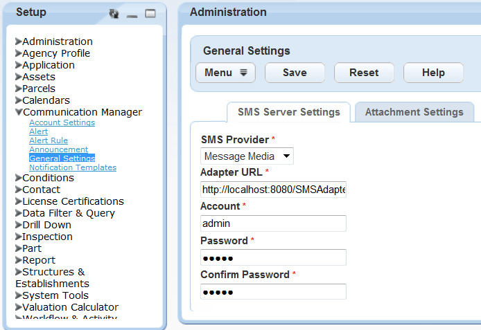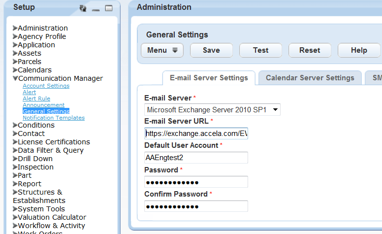 The general settings area is where you connect your Microsoft Exchange Server to Civic Platform. This is also where you establish system-level settings that enable agency users to send, receive, and store emails, calendar items, SMS text messages, and attachments.