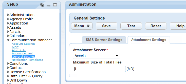 Maximum Size of Total Files To further restrict the maximum allowable size of attachments for a single email, beyond the scope of Civic Platform’s standard file size restrictions, enter a value in whole numbers here.
