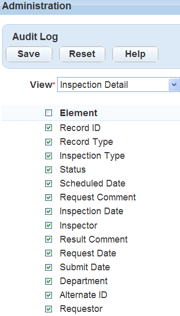 Table 1. Inspection Detail Audit Log Fields Alternate ID An identification other than the main identification, such as a parcel ID. Department The department responsible for the inspection modification, such as Building or Code Enforcement. Inspection Date The inspection's schedule date. Inspection Type The type of inspection, such as Building, Electrical, or Insulation. Inspector The inspector assigned to conduct the inspection. Record ID The application identification number. Record Type The type of application, such as a Commercial or Residential Building Permit. Request Comment Any comments related to the inspection. These comments can be user comments or those that populate based on predefined Standard Comments. Request Date The request date for the inspection. Requestor The name of the individual who requested the inspection. Result Comment Any comments related to the inspection. These comments can be user comments or those that populate based on predefined Standard Comments. Scheduled Date The inspection’s scheduled date. Status The inspection status, such as Approved, Pending, or Denied. Submit Date The date when a user submitted the application.