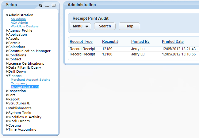 You must enable FID-0324 to enable access to the Receipt Print Audit portlet. Refer to the Accela Civic Platform Configuration Reference for details on enabling FIDs. After you enable this FID users can access the portlet from Setup Administration > Finance > Receipt Print Audit. The portlet displays as follows: