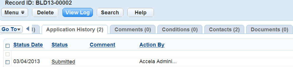 Table 1. Record Status History Audit Log Fields Action By The individual responsible for the application status modification. Action by Department The department responsible for the application status modification, such as Pending or Open. Comment Any comments related to the application status history update. The comments that display in the audit log can be those a user entered manually or those that Civic Platform populates by predefined Standard Comments. Status The status of the inspection record inspection status, such as Approved, Pending, or Denied. Status Date The date Civic Platform applied the current status. Status History Number A number automatically generated to identify and track the status history changes.