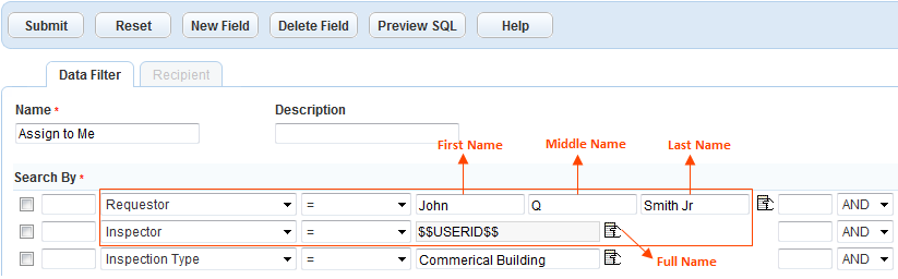 However, if you pick a variable as the search criteria, Civic Platform turns the three fields into a read-only Full Name field and populates the field with the specified variable.