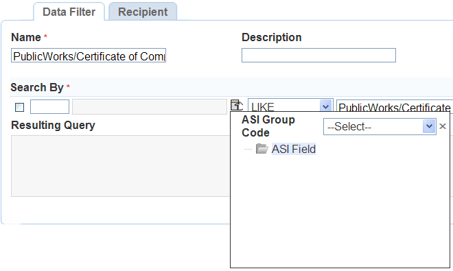 • If you select Custom Fields as the filter field in the drop-down, Civic Platform displays the Custom Fields groups page. Select a Custom Fields group code, and then find and click the desired field in the navigation tree to specify the field you want to filter.