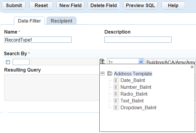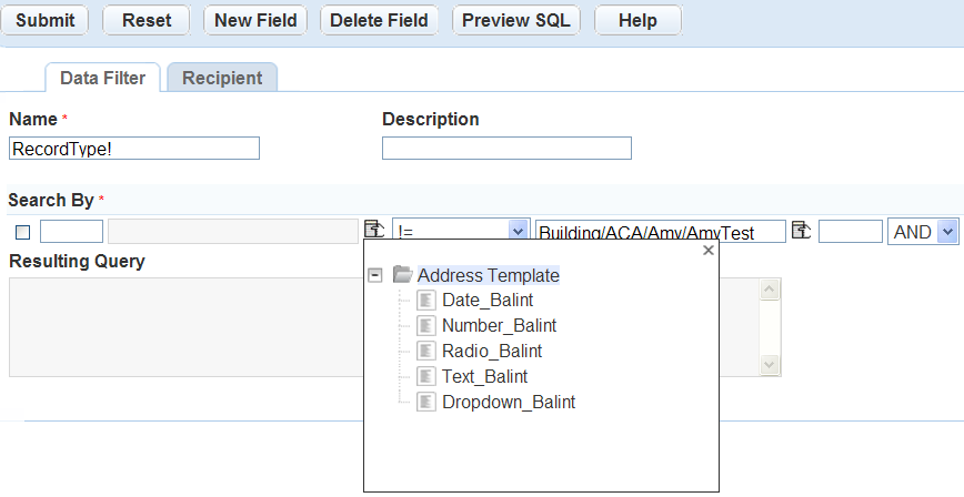 7. Click the Preview SQLbutton to view the SQL in the Resulting Query text field.