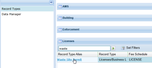 2. Open the record type for which you want to enable agency users to submit partially completed applications. In this example, we are using a Waste Site Permit application.