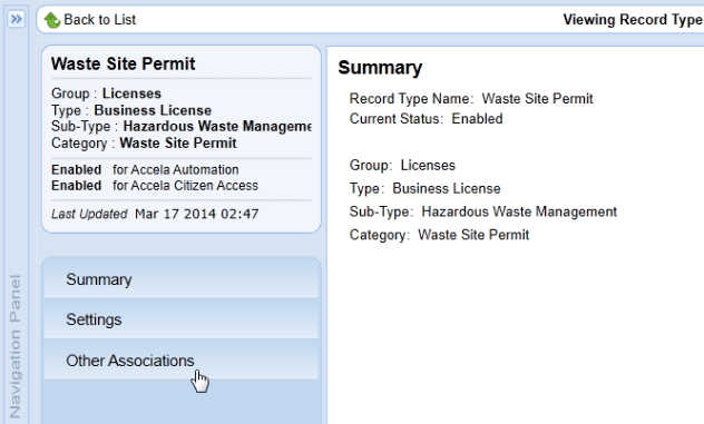 • Use the Other Associations portlet to configure other related items for the record type, such as fee schedule, expiration code, application specific information, and workflows. The Other Associations portlet is also where you can configure the ability for agency users to submit partially completed applications.