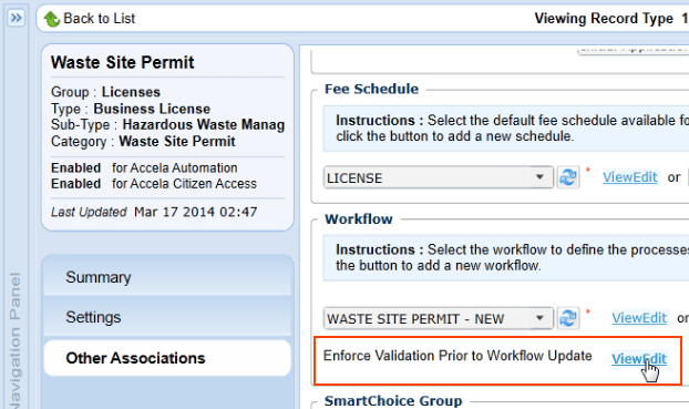 4. Scroll to the Workflow section, and in the Enforce Validation Prior to Workflow Update area, click View/Edit.