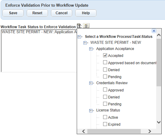 6. Use the navigation tree to select the workflow task and status that enforces application validation. For example, the Application Acceptance task, Accepted status. By deferring validation until the application reaches its Accepted status, agency staff can conduct business on the application without delay.