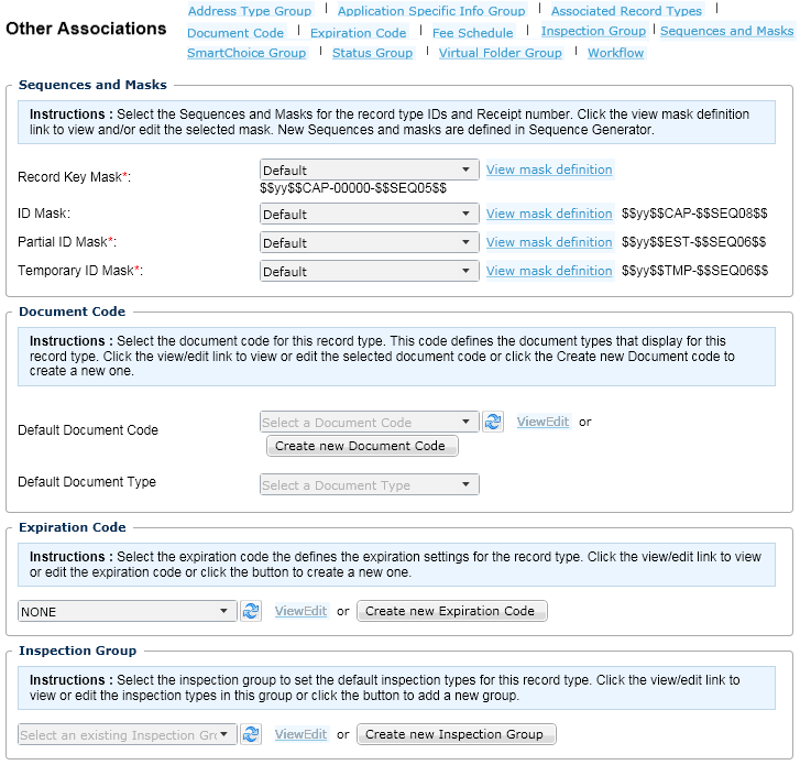 Address Type Group, Application Specific Info Group, Associated Record Types, Document Code, Expiration Code, Fee Schedule, Inspection Group, Sequences and Masks, Intake Form Configuration Group, Status Group, and Workflow.