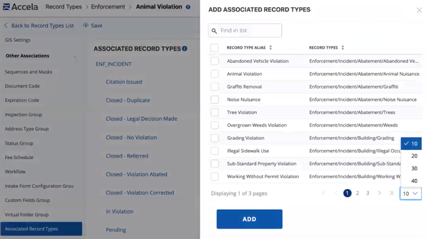 6. The section Associated Record Types shows the specific status options. When expanding a status group, the available Record Types with a matching status appear in a panel instead of a pop-up window. These results can be navigated using the search field or by using the page number. The number of results display per page can also be changed.