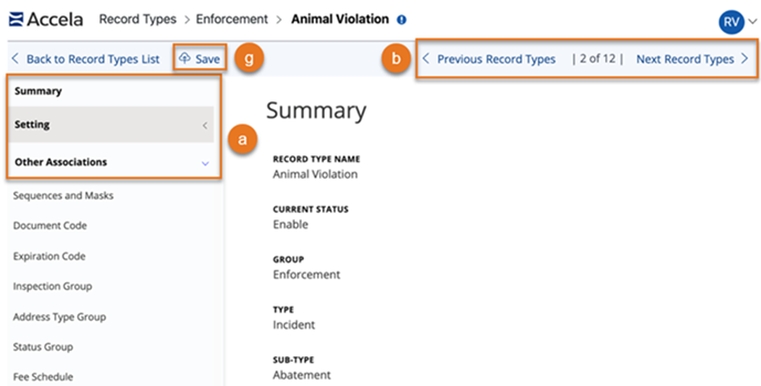 You can save and resume as you go, but you must review all three areas of configuration to ensure you properly configure the record type. Additional administrator configurations that you can apply to record types include Standard Comments and Conditions. Refer to Configuring Standard Comments and Setting Up Conditions.