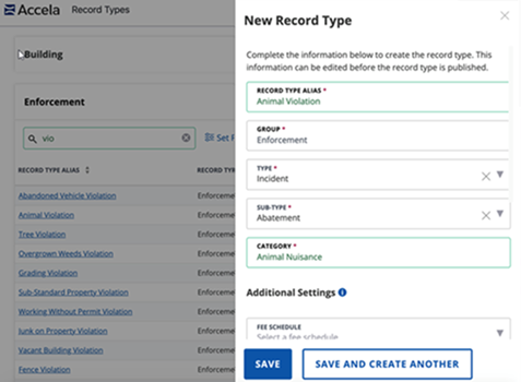 • Use the Settings portlet to configure additional record type features for add-ons, like Citizen Access and legacy Accela GIS.