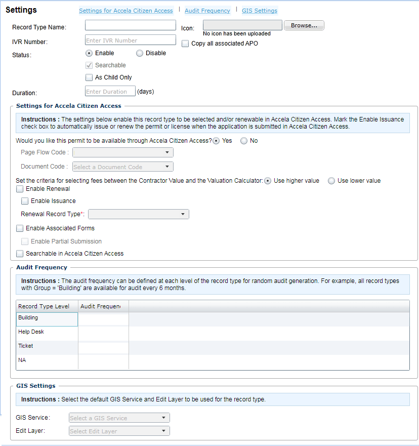After you define the basic configuration for a record type, you can complete the record type settings. These configurations include: settings for Citizen Access, Audit Frequency, and GIS Settings. For an overview of the Record Type Settings page, see Configuring Other Associations.