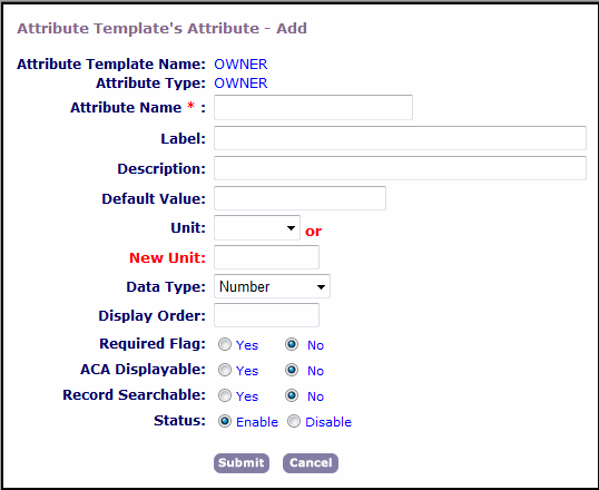 Citizen Access Displayable If you want Citizen Access to display this attribute, select Yes; otherwise, select No.Note: If you select No for this attribute, when users associate an APO that contains the attribute with a record, the attribute does not display in Citizen Access, but its value is stored for the record.