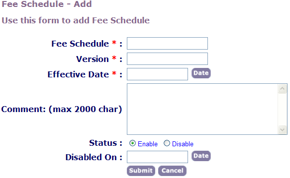 Click Create New Version and complete the fee schedule fields to create a new version of the fee schedule. The old version remains unchanged.