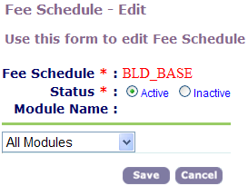 By default, every fee schedule functions in all modules. You can, however, limit a fee schedule to work in specific modules. For example, if your agency has a building module, a code enforcement module, and a service request module, you can have fee schedules, specific to building permits, that you do not want to assign to the other modules.