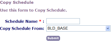 Schedule Name Enter a name for the schedule. Copy Schedule From Choose an existing schedule from the drop-down list. Click Submit.