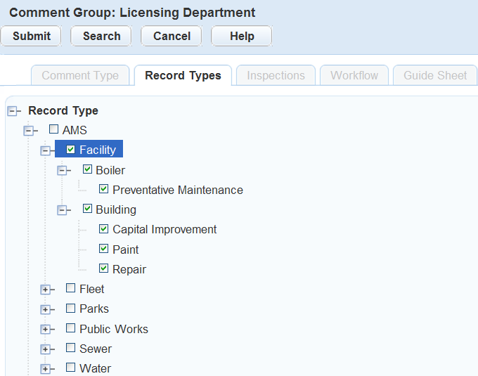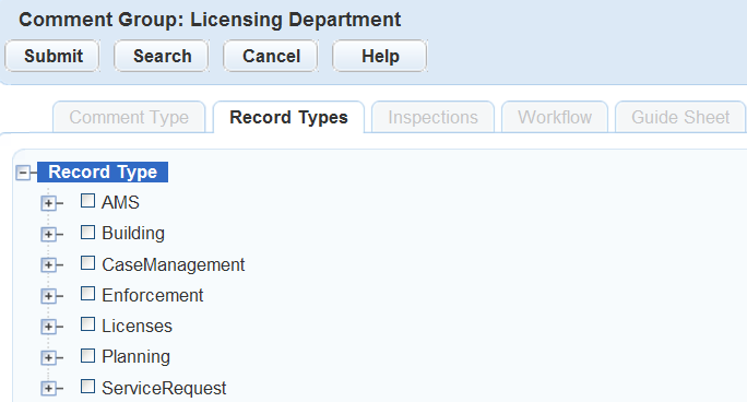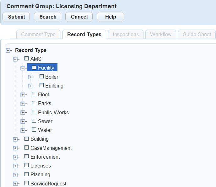 3. Use the + and - buttons to expand and collapse the tree to find the record type, checklist, inspection, or workflow to which you want to assign the comment group.