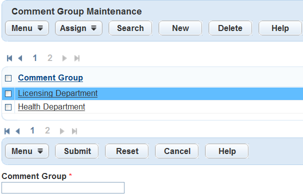 1. Access the Comment Group Maintenance portlet (Accessing the Comment Group Maintenance Portlet).