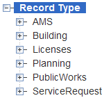 Civic Platform displays a navigation tree with the record types, checklists, inspections, or workflows created for your system.