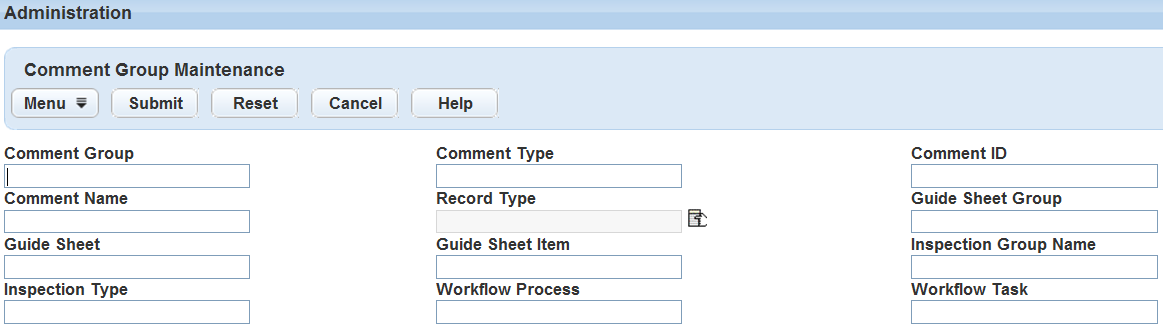 Permit Type Enter the name of permit type for the comment group you are searching for.Click the data picker icon next to this field to choose the Permit Type from a data navigation tree.