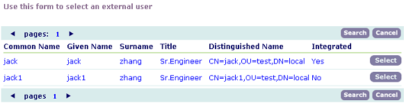 OU Search Root Enter the base organization unit to search. Common Name Enter the given, or first, name of the user to locate. Surname Enter the family, or last, name of the user to locate. - Click Search.