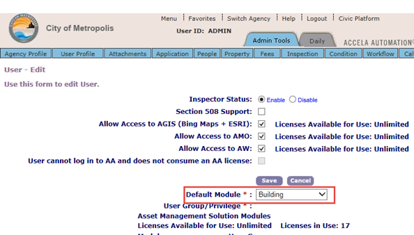 After a user account becomes inactive longer than the agency or user account disable time frame, or if the account password has expired, the user cannot access Civic Platform. The agency administrator must manually enable the account.