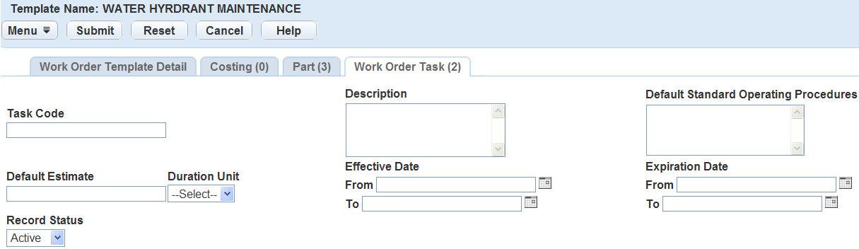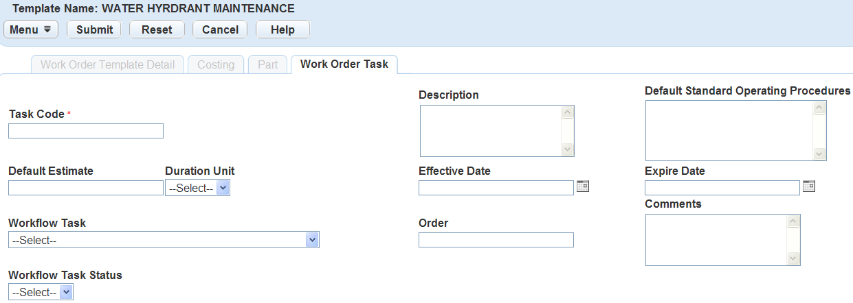 Enter the Work Order Task code and any other fields that display. For a list of field descriptions, see Table 1.