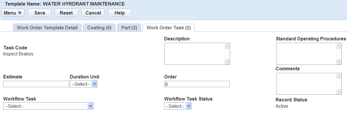 Users can create new work order tasks to attach to the work order template, attach existing tasks to the template, and edit the task to fit the needs of the template. For more information on work order templates, see Creating a Work Order Template.