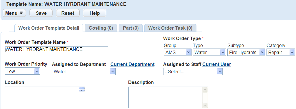 Table 1. Work Order Template Definitions Assigned to Department Select the department assigned to the work order. This field pre-populates the Assigned to Department field on the work order when creating a work order using the work order template. Assigned to Staff Select the staff member assigned to the work order. This field pre-populates the Assigned to Staff field on the work order when creating a work order using the work order template. Comments Enter any comments associated with the work order template. Description Enter the description associated with the work order template. Primary Use the drop-down list to set the work order template to be the primary one for the associated record type. When you create a work order, the basic work order information defined in the primary template automatically populates into the Assigned to Department, Assigned to Staff, Description, Work Order Type and Priority fields on the work order form. When the work order is submitted, the cost items, parts, and work order tasks within the primary template automatically associate with the work order, and they display under the corresponding tab. Record Status Record Status is a read-only field that indicates if a work order template is Active or Inactive. The record status is always Active, unless you delete the template. Work Order Priority Select the priority of the work order. This field pre-populates the Work Order Priority field on the work order when creating a work order using the work order template. Work Order Template Name Enter the name of the template created for the work order. Civic Platform uses this name to identify the template when creating a new work order. Work Order Type This field is a combination of four fields: Group, Type, Subtype, and Category. Each field is dependant upon the next. Select the work order type group. When you select the group, the type drop-down list displays. Select the type. When you select the type, the subtype drop-down list displays. Select the subtype. When you select the subtype, the category drop-down list displays. Select the category. Civic Platform uses these fields to pre-populate the work order group, type, subtype, and category when a user creates a work order using the work order template.