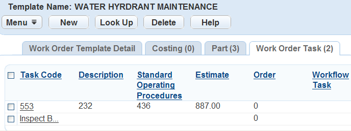 Users can create a new work order task through the work order template. This not only associates the new work order task with the template, but adds the new task to the Master Work Order list, which you can use with other templates.