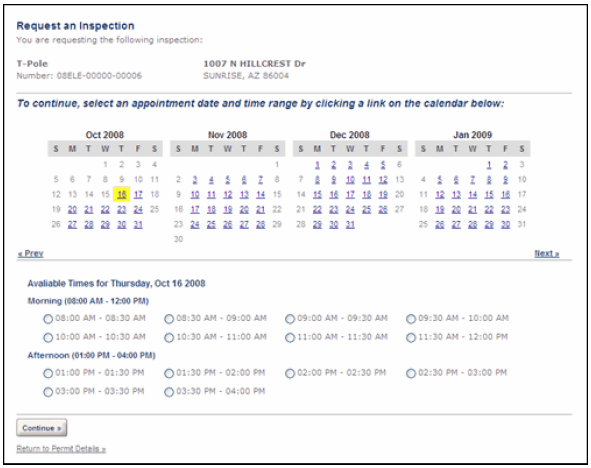If your agency only conducts inspections from 8:00 am to 12:00 pm, you can create a calendar with available inspection times from 8:00 am to 12:00 pm. Configuring your calendars this way enables you to direct users only to the calendar times available for inspection scheduling.