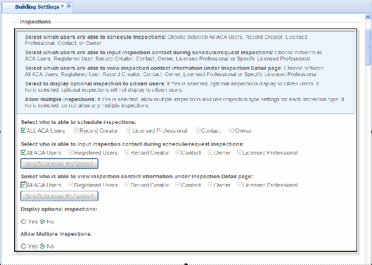 Figure: Citizen Access Settings for Inspection Scheduling