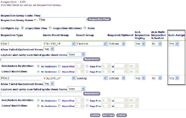 3. Set the Auto Assign drop-down list value to Yes for each of the inspection types you want to subject to automatic scheduling (Inspection Type Configuration).