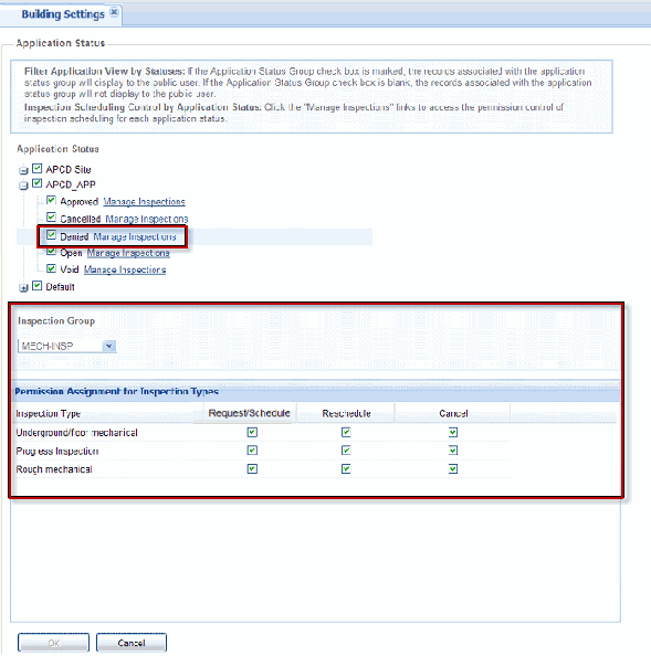 2. From the Application Status section of Module Settings page in Citizen Access Setup, restrict public users’ scheduling permissions to certain inspection types for a particular record status, if required (Citizen Access for Restricting Inspection Scheduling). See also “Application Status” in the Citizen Access Administrator Guide.