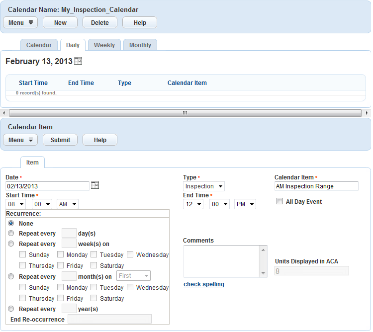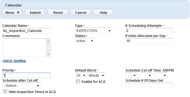 2. Set up the number of units per day to allocate for inspections (Calendar Detail Field Descriptions).