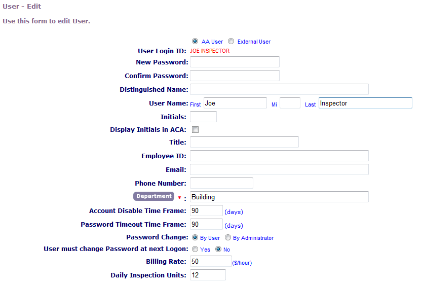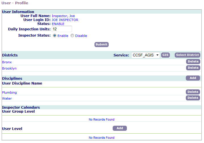 3. Edit the user profile to include the districts and disciplines that apply to the inspector.