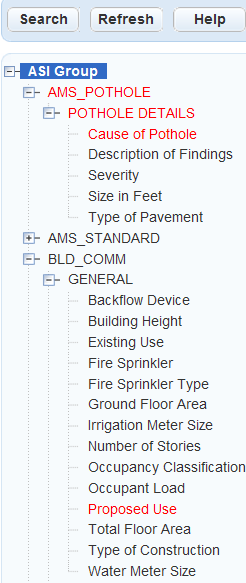 Civic Platform highlights in red all matched records through the entire Custom Fields (ASI) Security navigation tree.