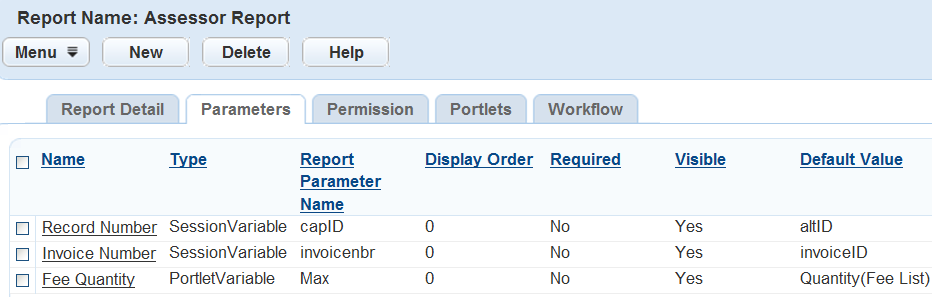 Report parameters must exactly match the spelling of the parameter in the physical report. This includes parameters users must enter manually, as well as those provided by Civic Platform and automatically sent to the report. An example of an Accela provided parameter is record ID. The Building portlet supplies the record ID and automatically displays it on the report.