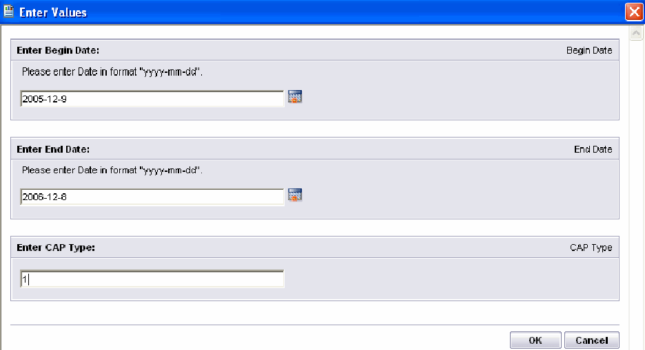 Parameters not set up in Report Manager and required in the report display the parameter prompt window. These parameters require users to enter exact values to correctly filter the report. For example, users must enter dates in the correct format, MM/DD/YYYY or yyyy-mm-dd. The figure below shows a sample Crystal Reports parameter prompt.