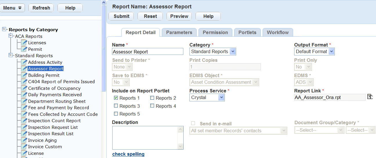 When adding a report to the reports administration, you must specify the report process service such as Crystal, Oracle, Microsoft Reporting, Accela Report Writer, RTF, or URL Report. This identification sends the request to execute the appropriate report engine when a user runs a report. Depending on the report service, different formatting options are available including Adobe Acrobat (.pdf), Microsoft Excel (.xls), Rich Text Format (.rtf), and many others. A preview of each report is available from the Report Detail form portlet. Use the preview to confirm that the correct reporting engine launches and the correct report displays before moving on to additional setup and configuration steps.