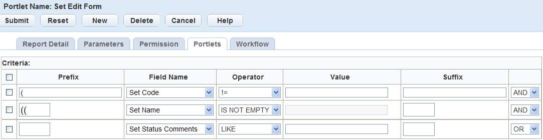 Prefix Enter the prefix for the field name you want to use to set the criteria. You can also use Prefix to handle complicated criteria using brackets for the LIKE and OR expressions. See screen shot below. Field Name Select the portlet field for which you want to set criteria on the selected portlet. For example, to set criteria for building permits with an Approved status, select a field name of Status, and Operator of =, and a Value of Approved. Operator Select the appropriate operator you want to use in the criteria formula for the selected field. For example, to set criteria for building permits with an Approved status, select a field name of Status, and Operator of =, and a Value of Approved. Value Enter the appropriate value used to determine the criteria. For example, to set criteria for building permits with an Approved status, select a field name of Status, and Operator of =, and a Value of Approved. You can also use the wildcard % with the value. For example, to include all Permit Types that start with “Building,” use the value “Building%” with the wildcard. Suffix Enter the suffix for the field name you want to use to set the criteria. You can use Suffix to close complicated criteria using brackets in the Prefix for LIKE and OR expressions. See screen shot below. AND/OR Select one of the following to join two or more criteria conditions.AND operator displays a row of ALL conditions listed that are true. OR operator displays a row of ANY of the conditions listed that are true. Figure: Prefixes and Suffixes in Report Criteria